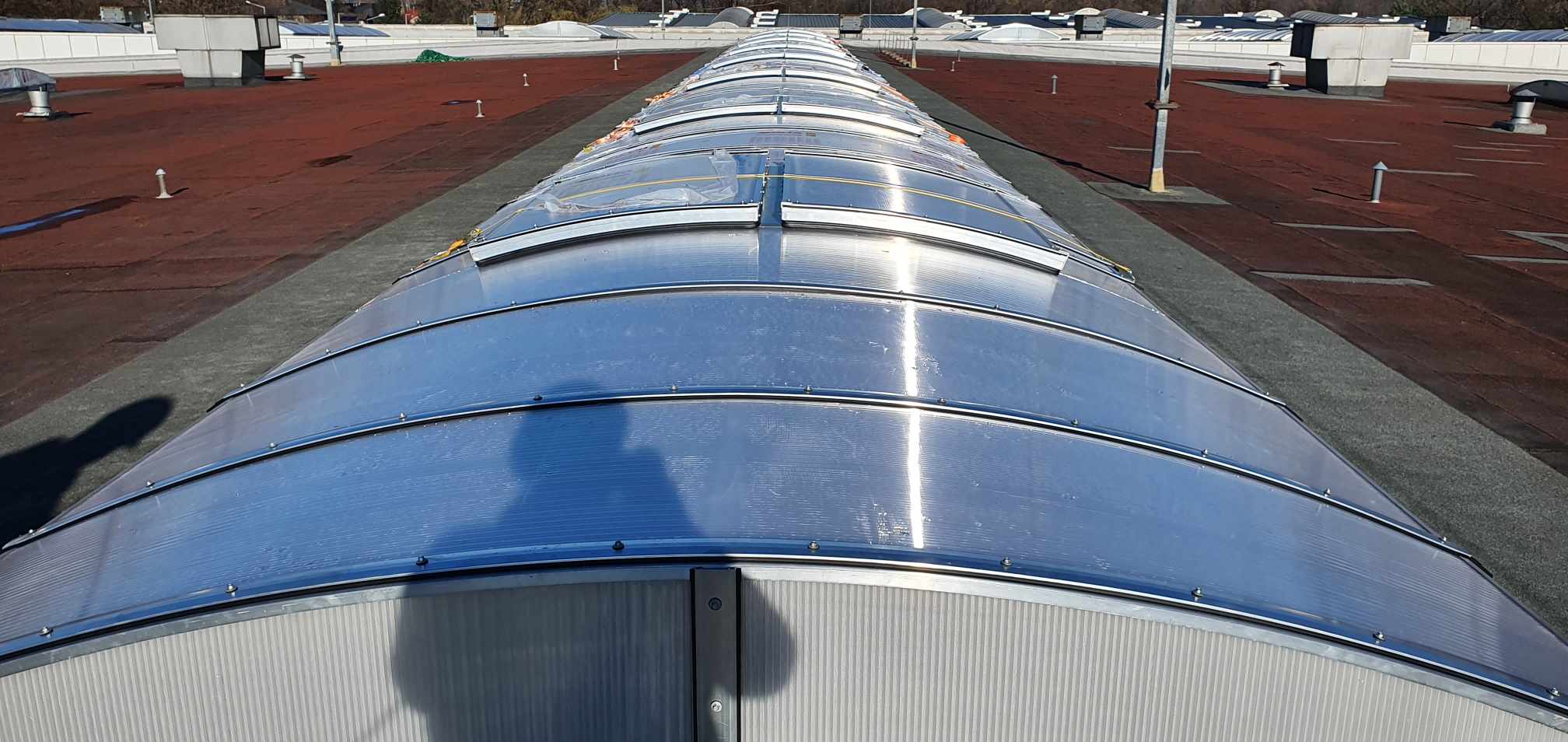 On the existing building of the Brewery in Żywiec, we undertook to dismantle the old skylights. In this place, we proposed new skylights equipped with smoke vents with 24V electric drive. All rooflights are secured with anti-fall grids.