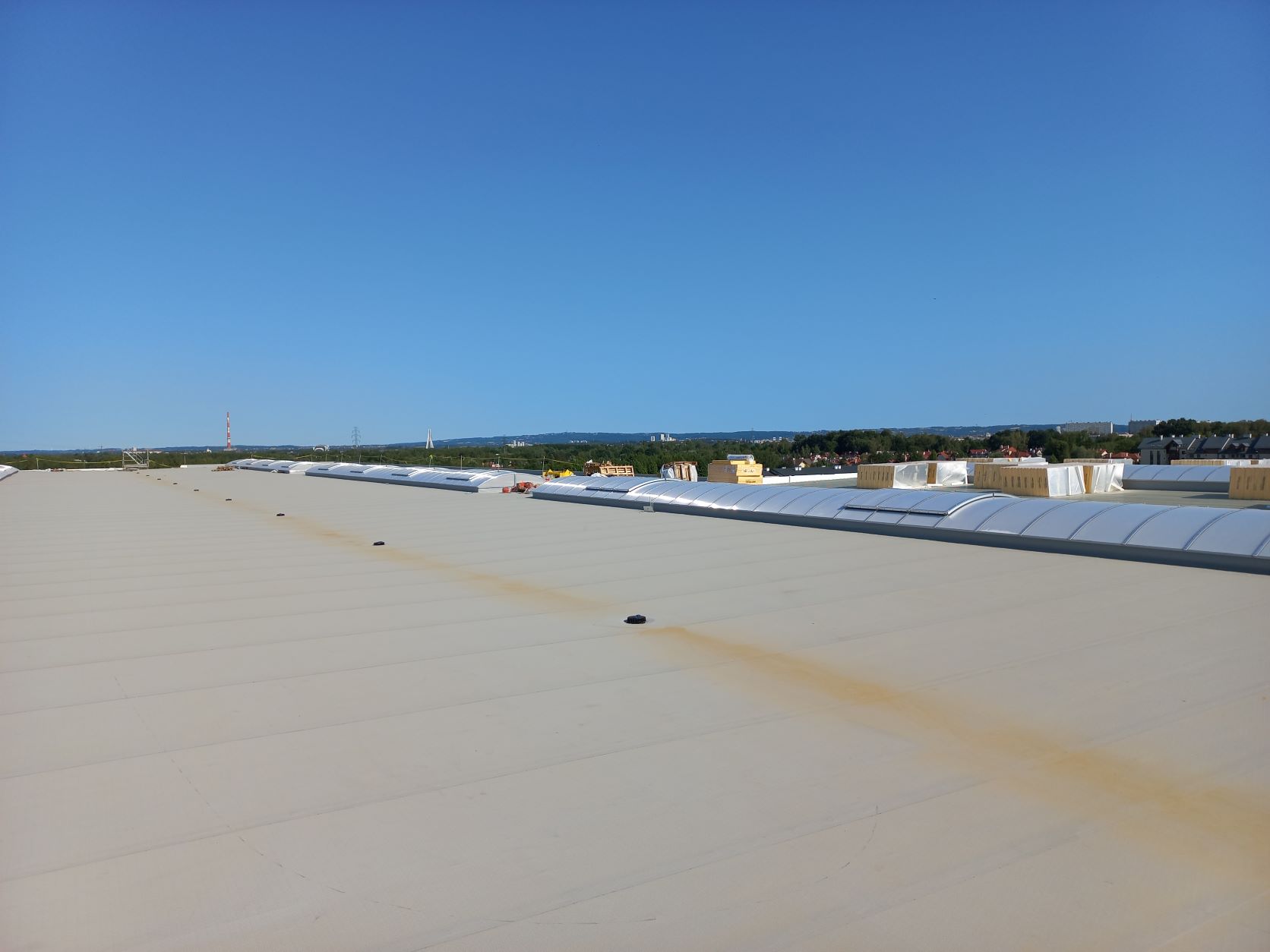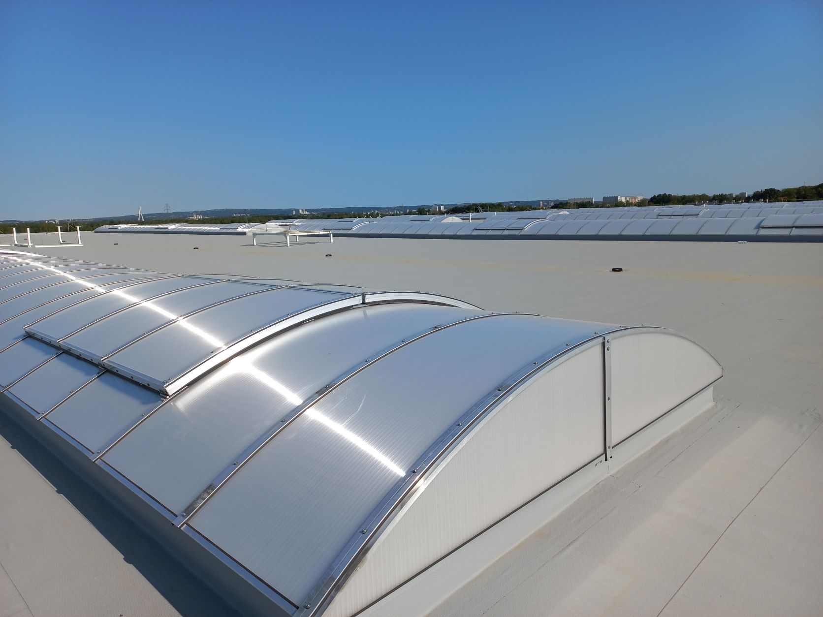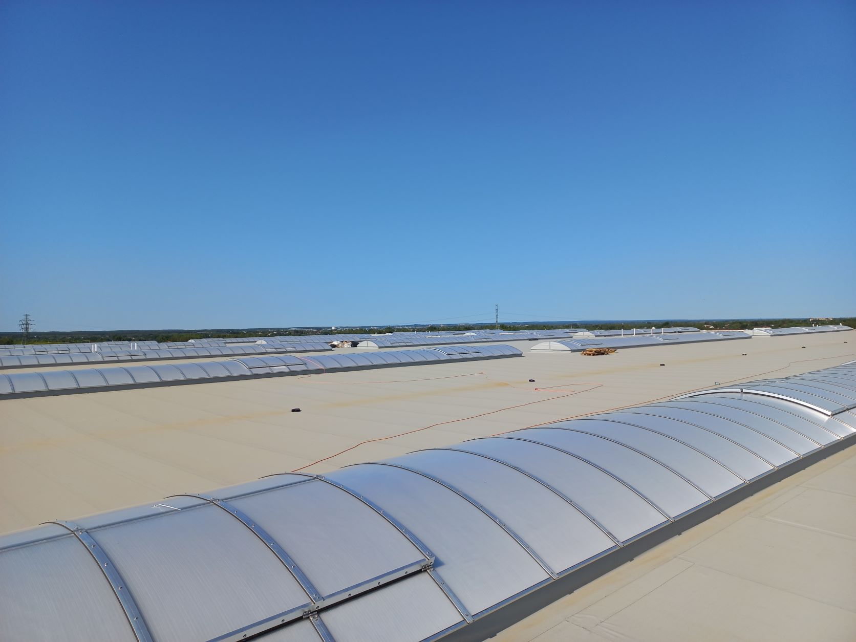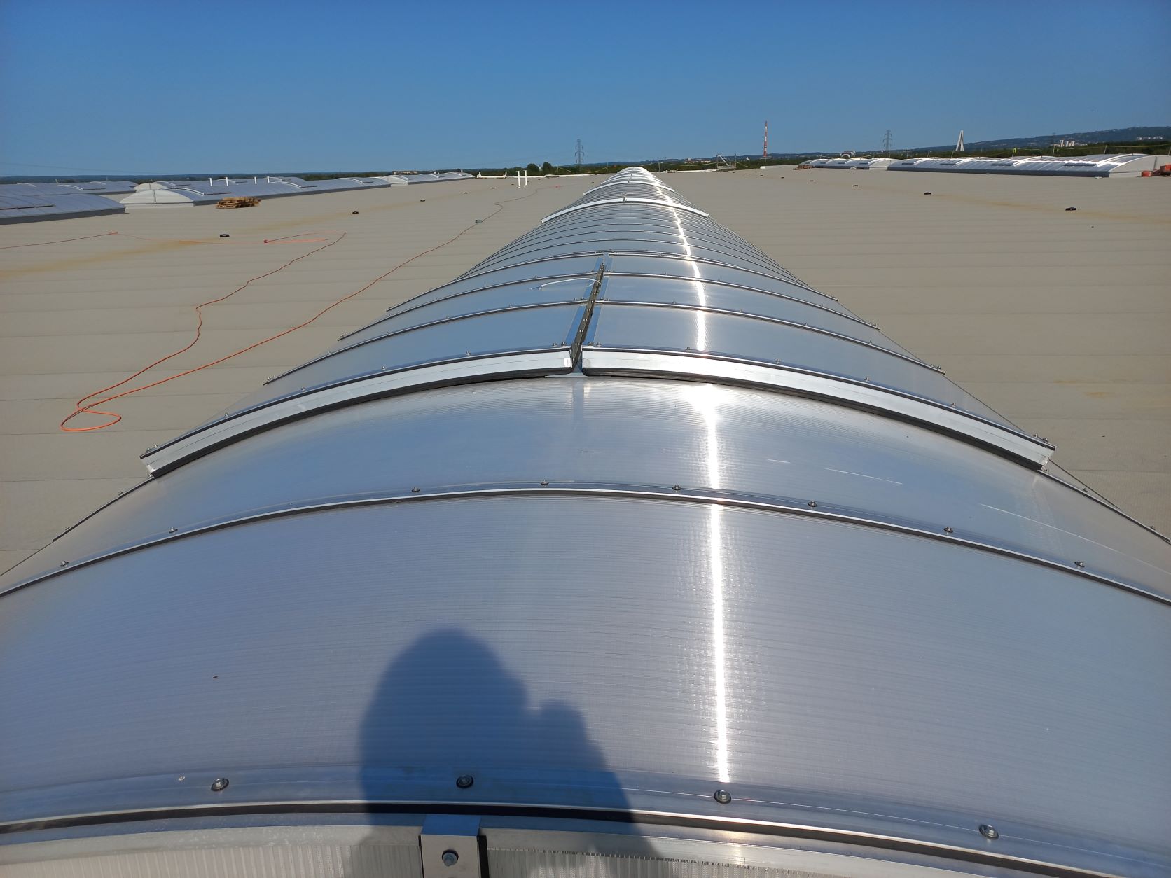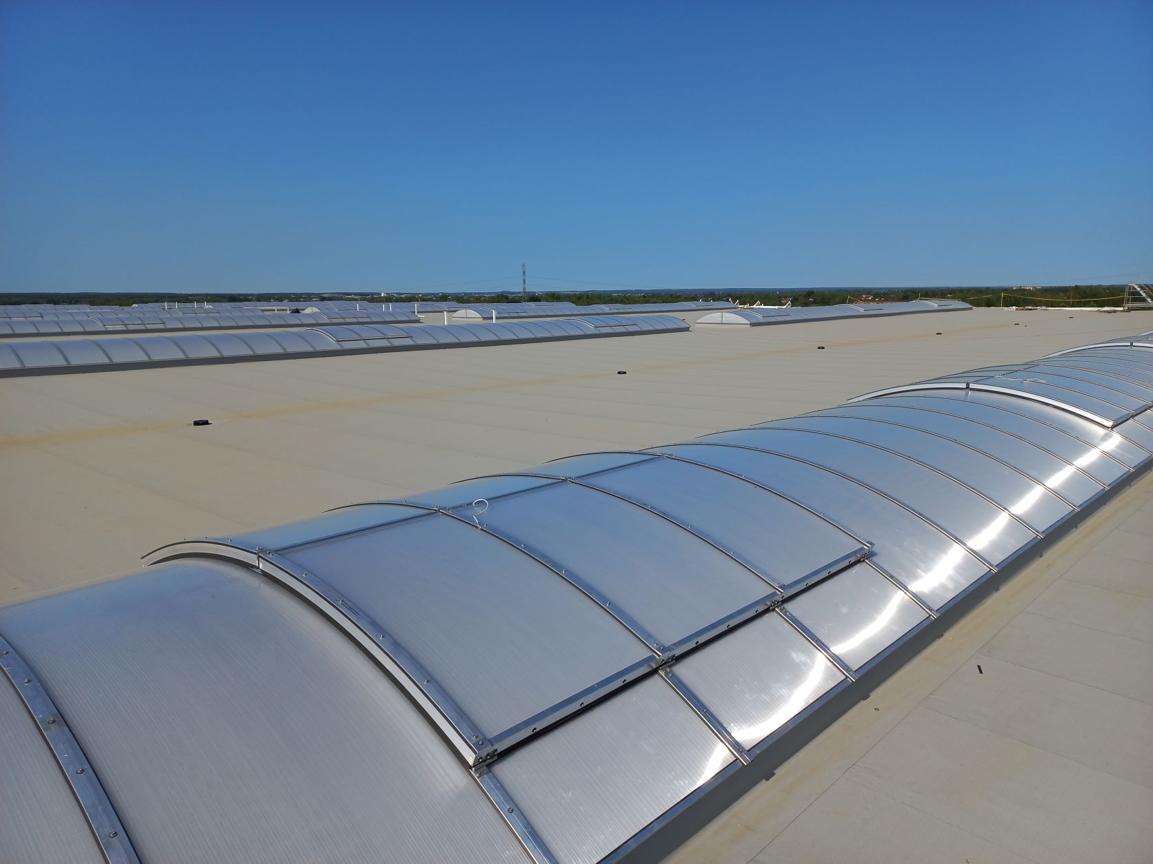 In cooperation with Polimex Infrastruktura, at the Knorr-Bremse facility, we realized the delivery and installation of continuous rooflights equipped with double-leaf smoke vents with pneumatic drive and additional ventilation function realized with 230V electric actuators. We installed, over the office spaces, fixed continuous rooflights and a skylight. The installation of both the pneumatic smoke extraction system and the electrical ventilation system was the final stage of work on this facility. The entire work began with our design of the smoke extraction project.