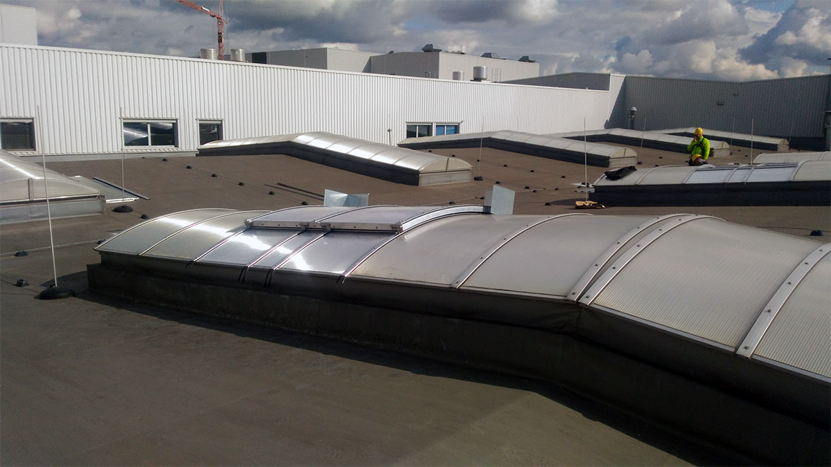 In the Volkswagen factory in Antoninek Poznań we disassembled the existing glass skylights, then we installed our continuous rooflights.