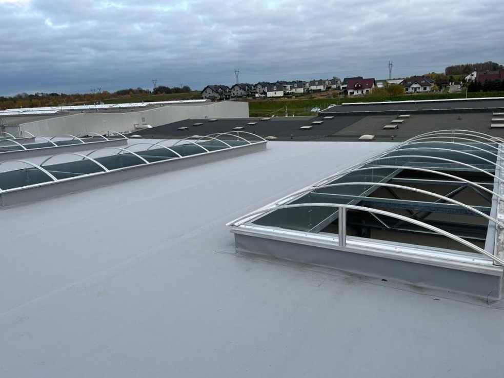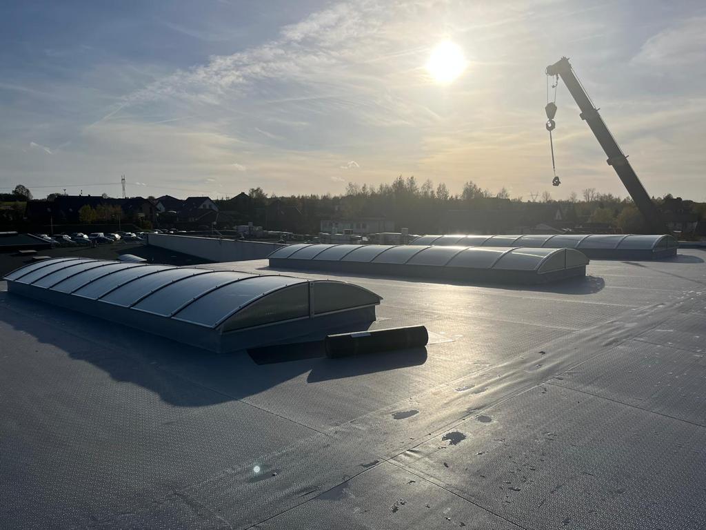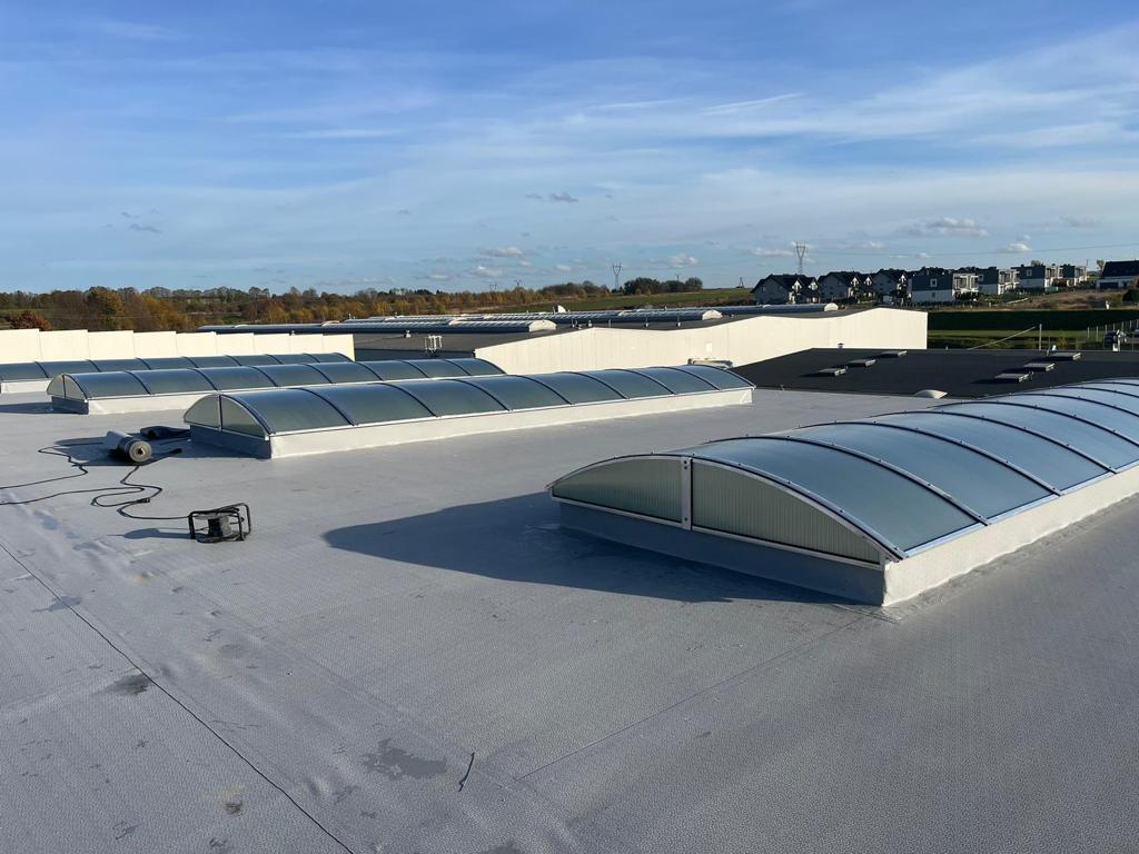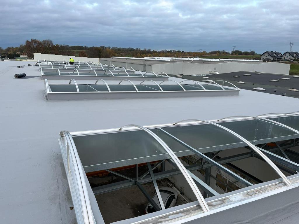 Na inwestycji dla Hako Technology Sp. z o.o., w koszalińskich Chałupach, podjęliśmy się montażu pasm świetlnych. Tym razem pasma nie zawierają w sobie elementów otwieranych, tj. klap dymowych ani przewietrzających, ale za to pokryte są dodatkową, zewnętrzną warstwą Solar Control, zapobiegającą nadmiernemu nagrzewaniu się pomieszczeń znajdujących się pod pasmami.