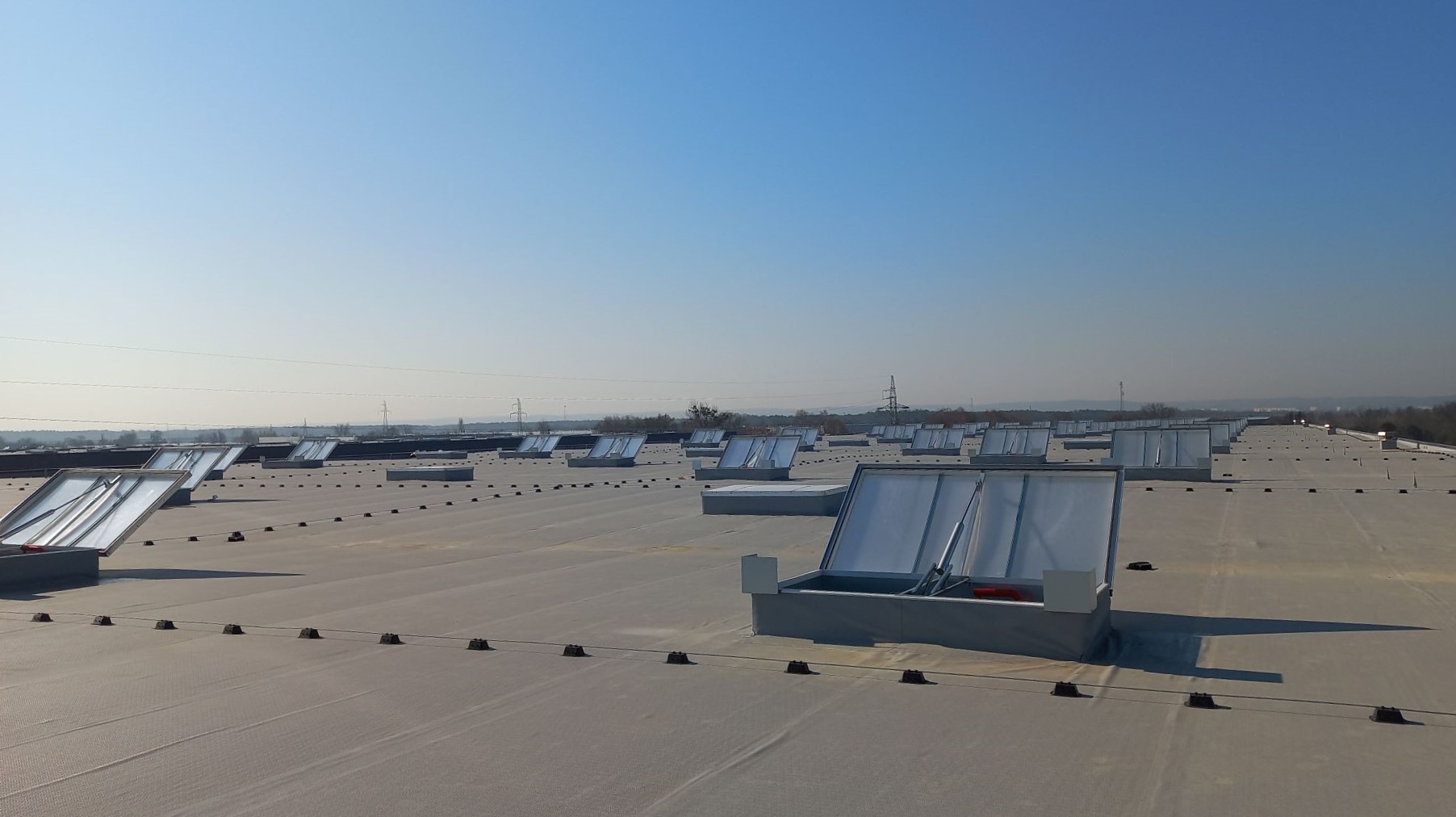 Zakończyliśmy prace na obiekcie Panattoni w Szczecinie. Od Atlas Ward Polska Sp. z o.o. otrzymaliśmy zadanie zaprojektowania, dostawy i montażu klap dymowych oraz świetlików dachowych na dwóch halach magazynowych z częścią biurową. Zastosowaliśmy punktowe klapy dymowe z napędem pneumatycznym wraz z niezbędną do ich prawidłowego działania instalacją. Aby dostatecznie doświetlić wszystkie pomieszczenia zamontowaliśmy dodatkowo świetliki dachowe. Klapy dymowe oraz świetliki wyposażyliśmy w kraty antyupadkowe. Pokrycie produktów wykonaliśmy w technologii NRO KERA Fire Protect, zapewniającej klasyfikację Broof(t1).