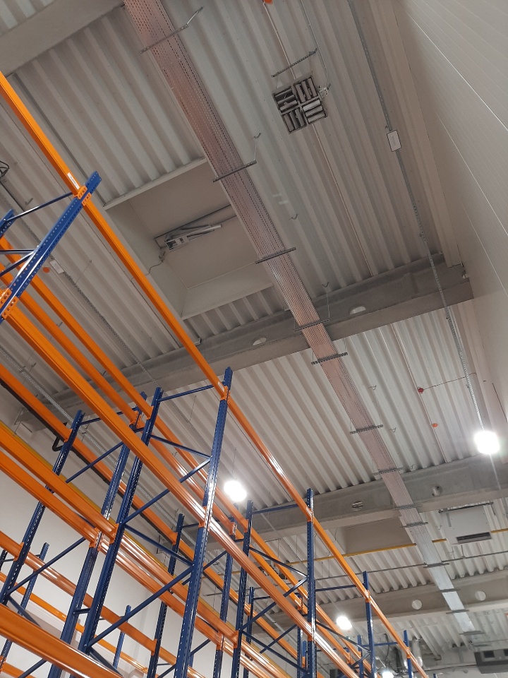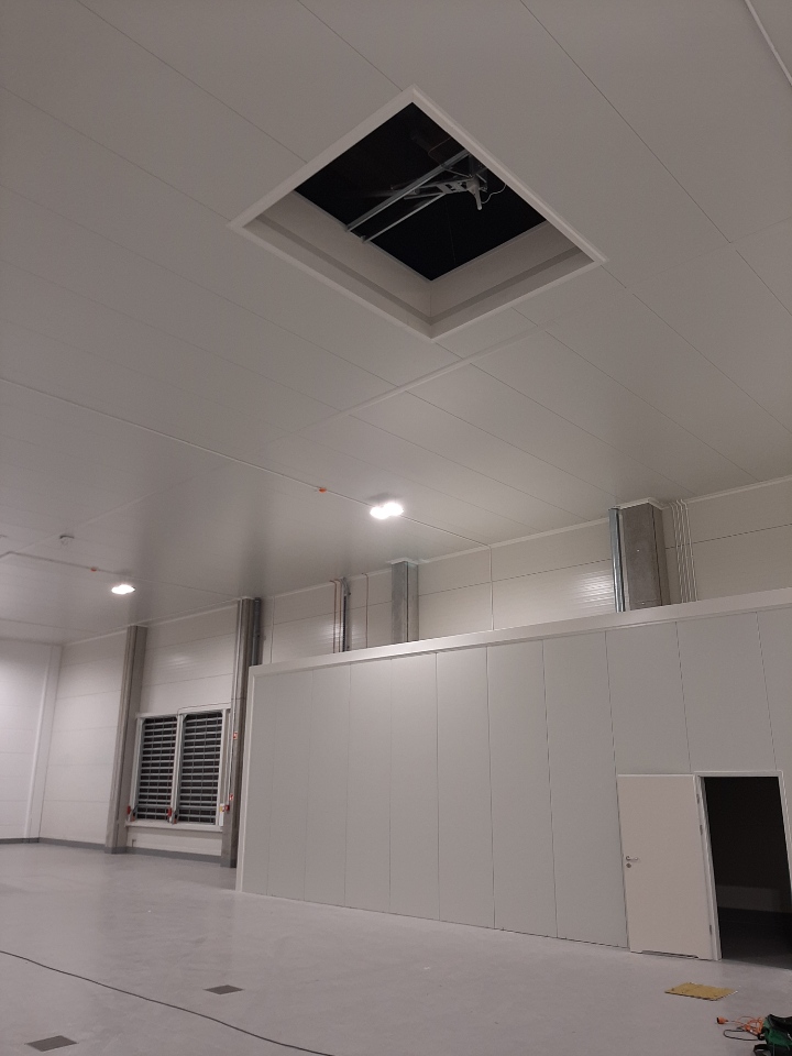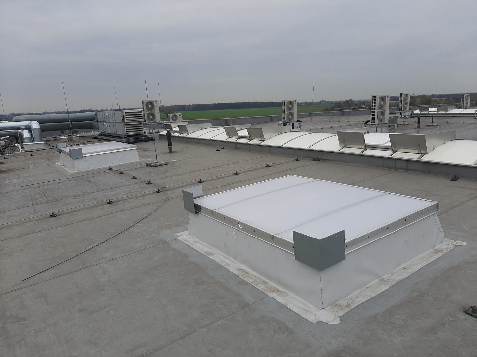 Na obiekt Puratos Polska Sp. z o.o., na zlecenie Jakon Sp. z o.o. dostarczyliśmy i zamontowaliśmy klapy dymowe jednoskrzydłowe z napędem pneumatycznym oraz funkcją przewietrzania, realizowaną za pomocą elektrycznych siłowników 230V. Część klap dymowych została dodatkowo wyposażona w dodatkowe, nietransparentne pokrycie. Zarówno te pokrycia jak i podstawy wszystkich klap dymowych zostały pomalowane w jednolitym kolorze z palety RAL. Do naszych zadań należało także przygotowanie i zamontowanie instalacji pneumatycznej oddymiania oraz elektrycznej przewietrzania.