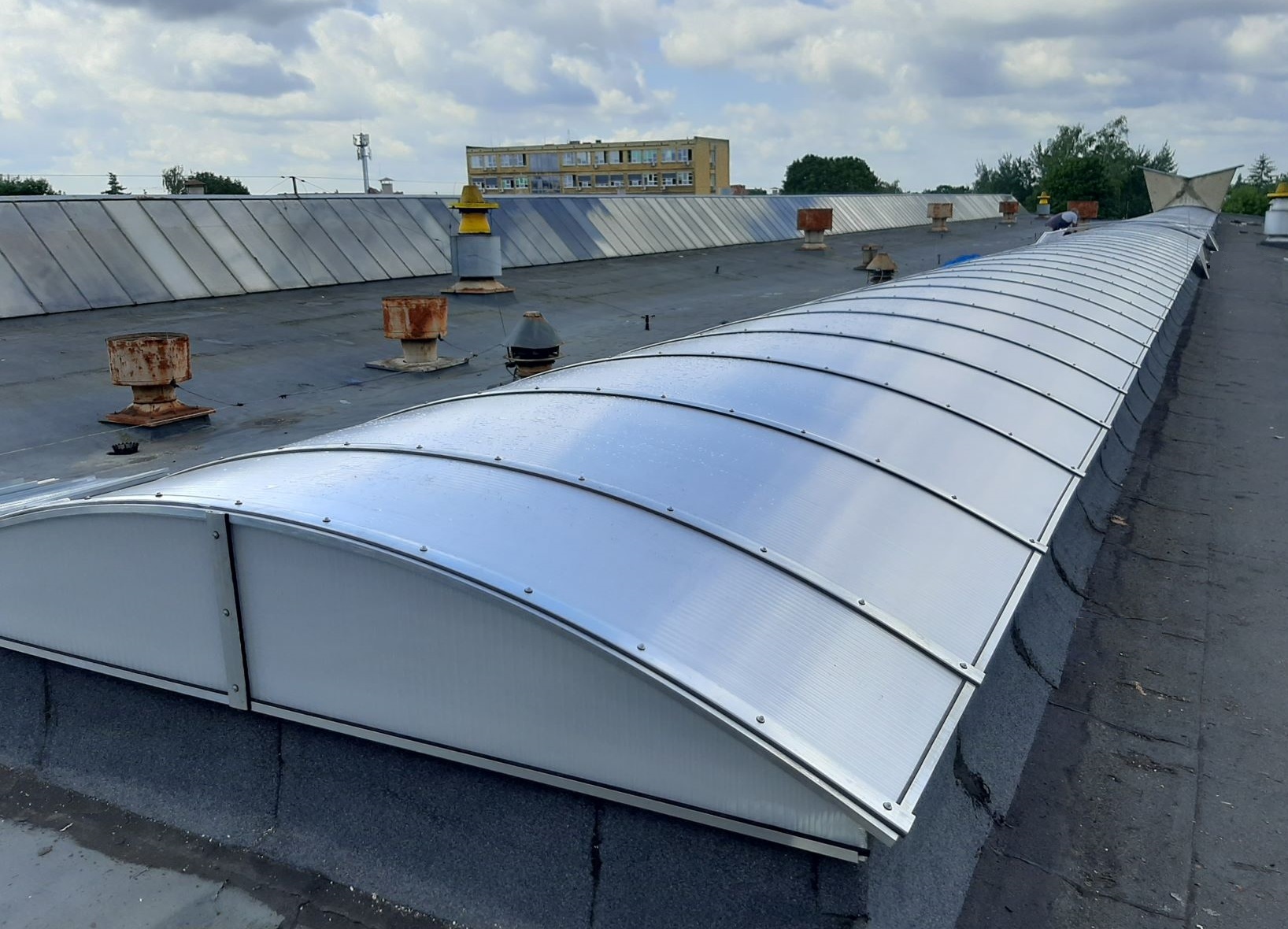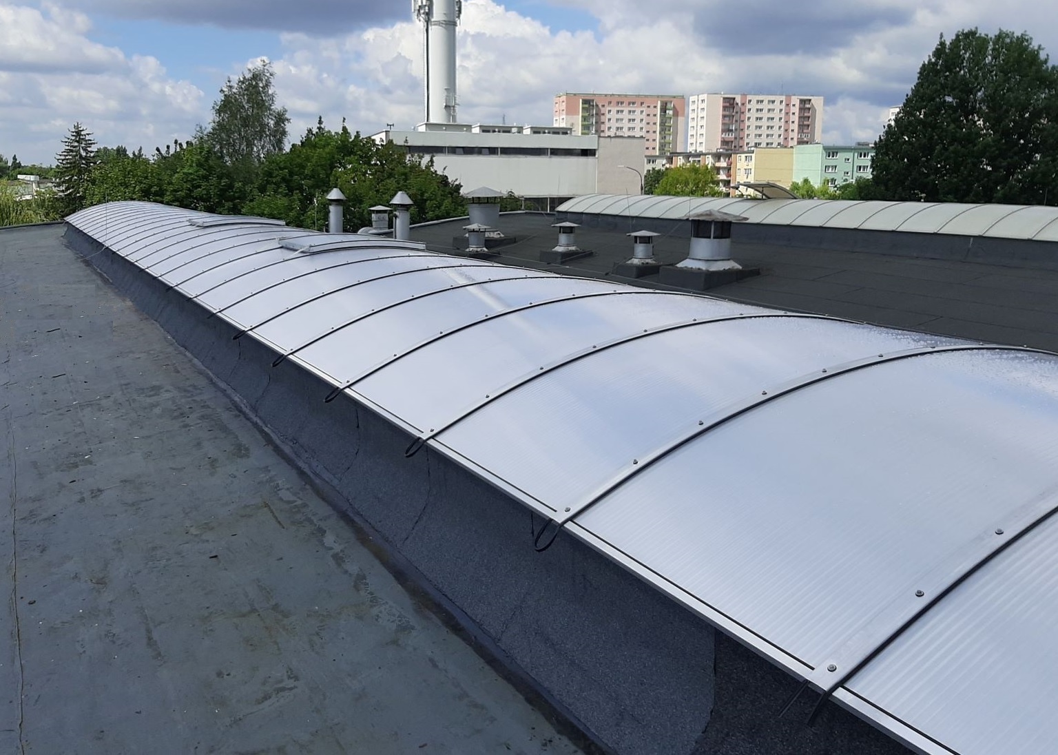 На прохання Przedsiębiorstwo Wielobranżowe OL-AN Aneta Olejniczak зі Сквєжини ми виконали заміну скляних світлових смуг на даху існуючої будівлі Щецинського трамвайного депо. Ми замінили старі смуги на світлові смуги Kera Awak з облицюванням із стільникового полікарбонату в технології NRO KERA Fire Protect, що забезпечує класифікацію Broof(t1). Окрім рівномірного освітлення інтер'єру будівлі, ми також забезпечили функцію вентиляції для користувачів будівлі, встановивши вентиляційні заслінки в стрічках разом з необхідною електропроводкою.
